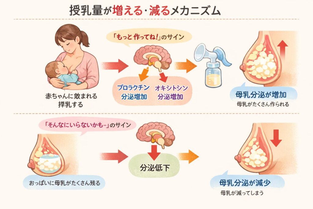 この「出せば作られる」「たまると作る量が減る」という流れを意識すると、搾乳と授乳のバランスを考えやすくなります。
